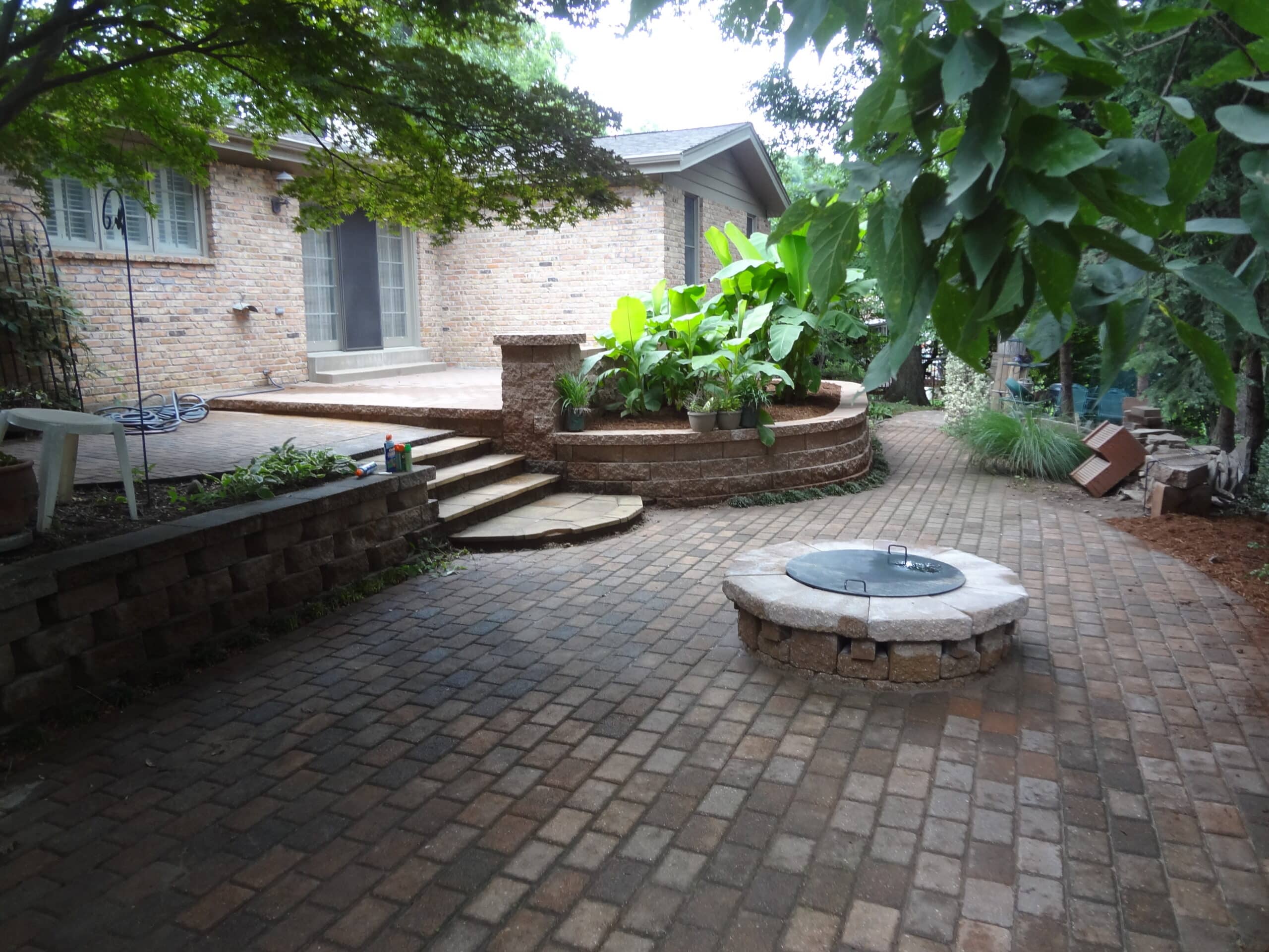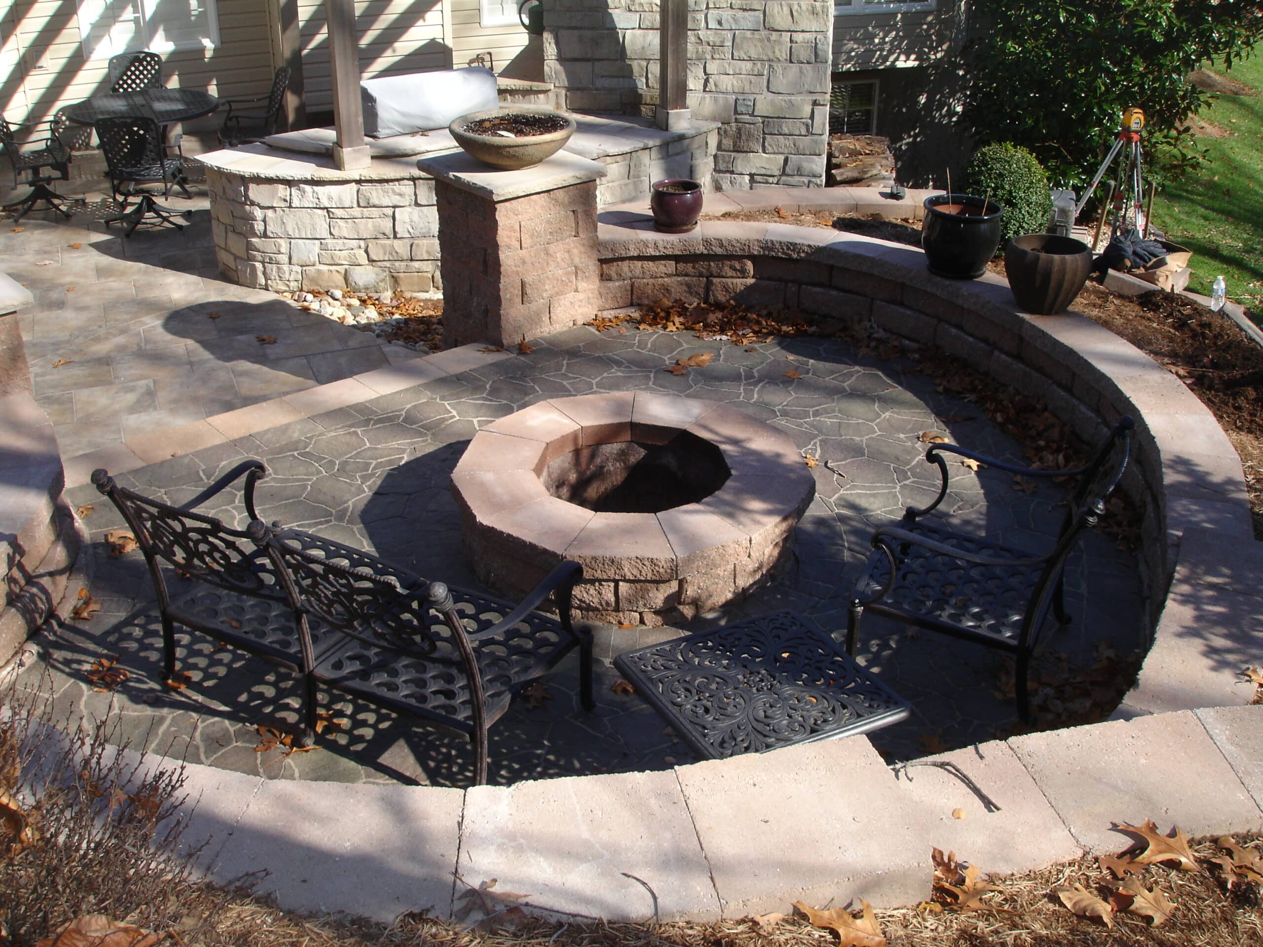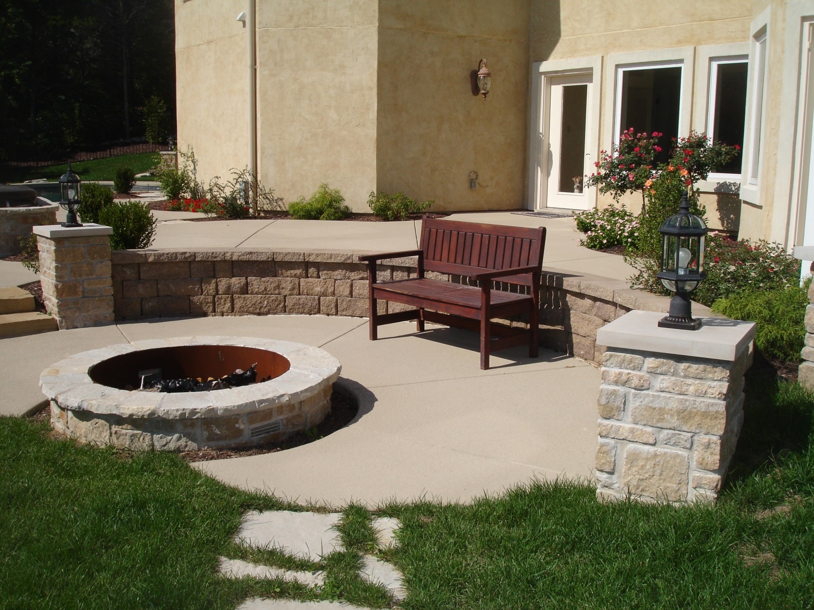 - Stone firepit with stone pavers and stone retaining wall from Lawn Systems, Inc., St. Louis, Missouri