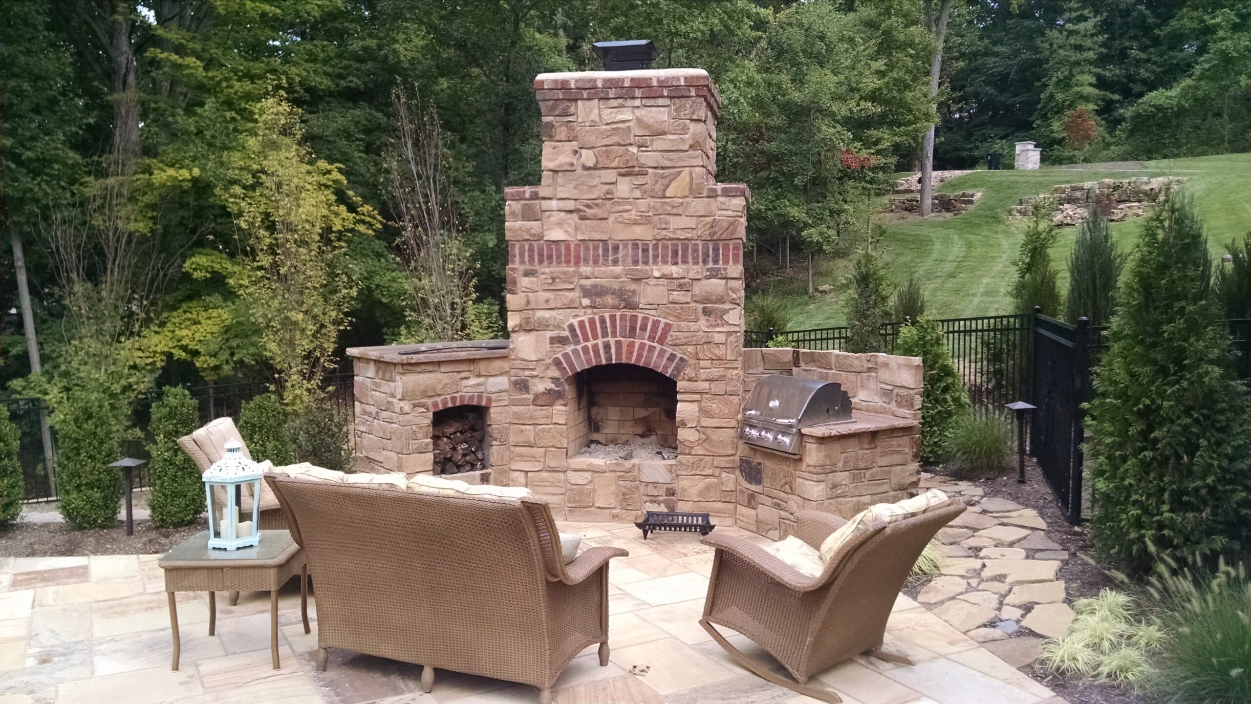 - Custom firepit and stone walls, steps with trees and bushes surrounding patio area from Lawn Systems, Inc., St. Louis, Missouri