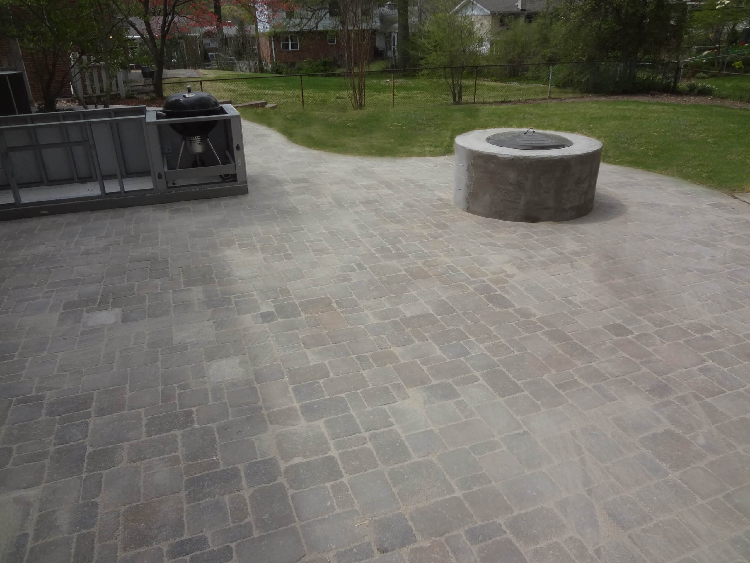 - Pavers and firepit in the backyard leading to grass area with landscaping from Lawn Systems, Inc., St. Louis, Missouri