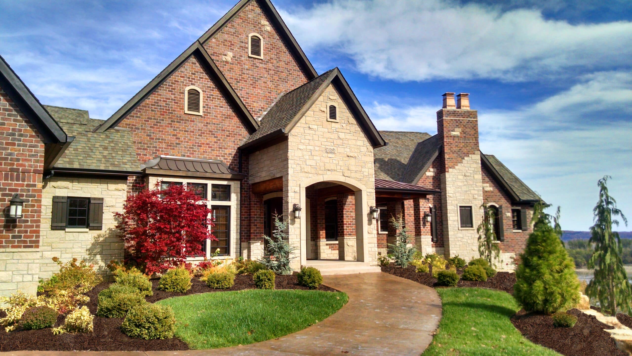 - Exterior brick home with landscaping and retaining walls from Lawn Systems, Inc., St. Louis, Missouri
