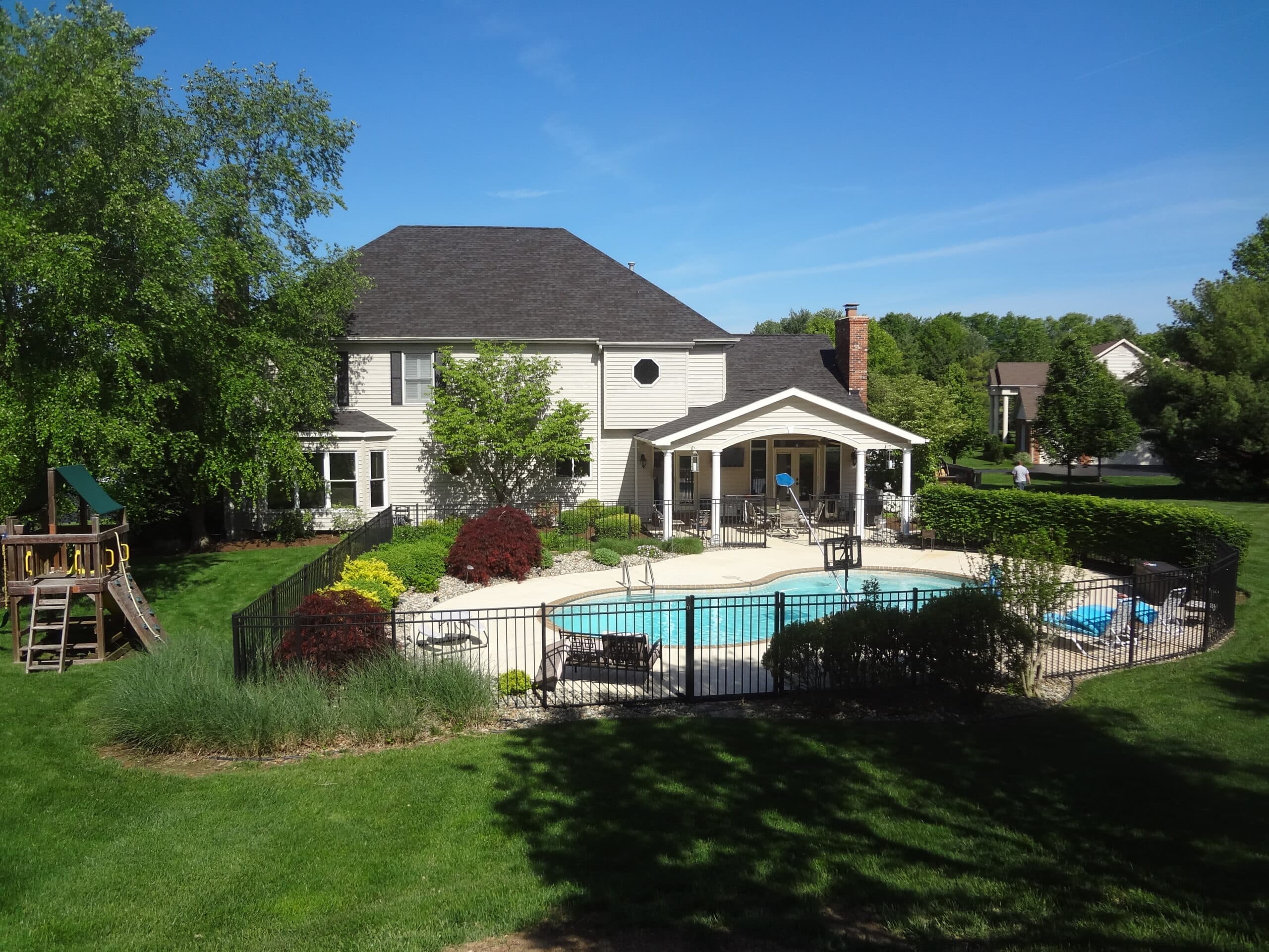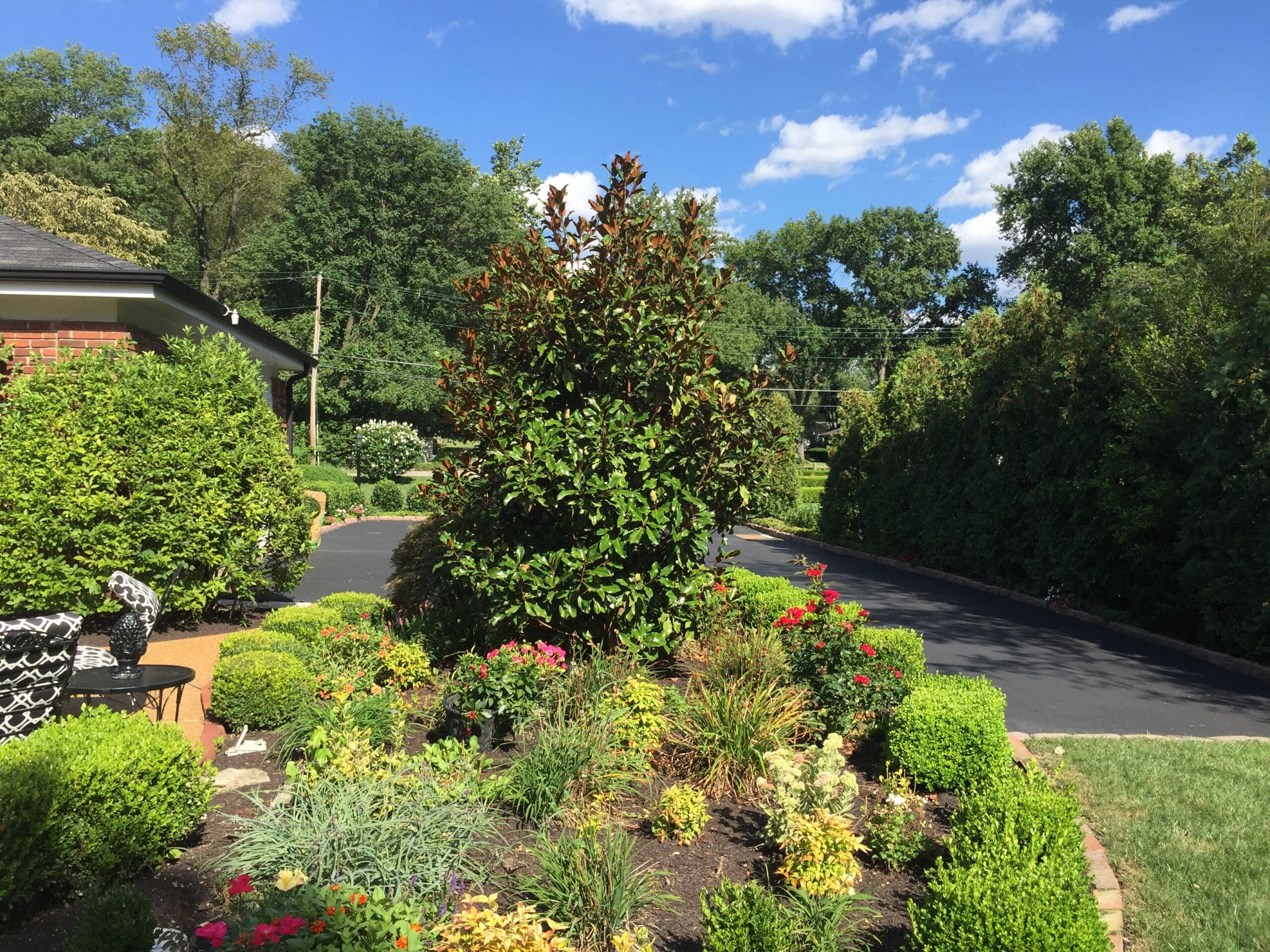 - Exterior landscaping with gate, bushes, trees, and pavers from Lawn Systems, Inc., St. Louis, Missouri
