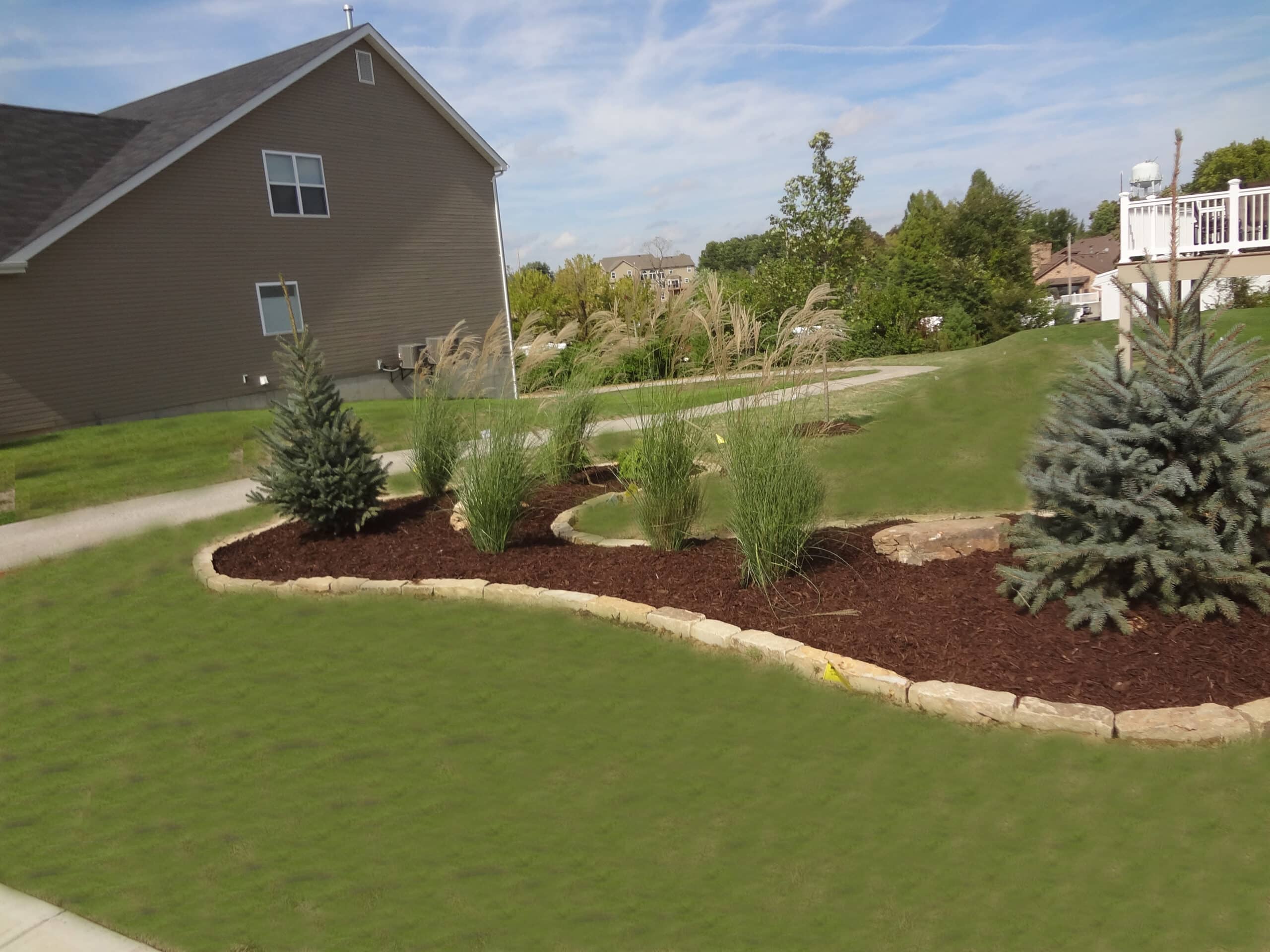 - Brick home with side sloping yard with stone accents and bushes from Lawn Systems, Inc., St. Louis, Missouri