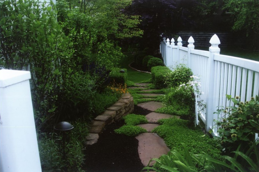 - Natural Stone walkway leading to backyard gate next to a home from Lawn Systems, Inc., St. Louis, Missouri
