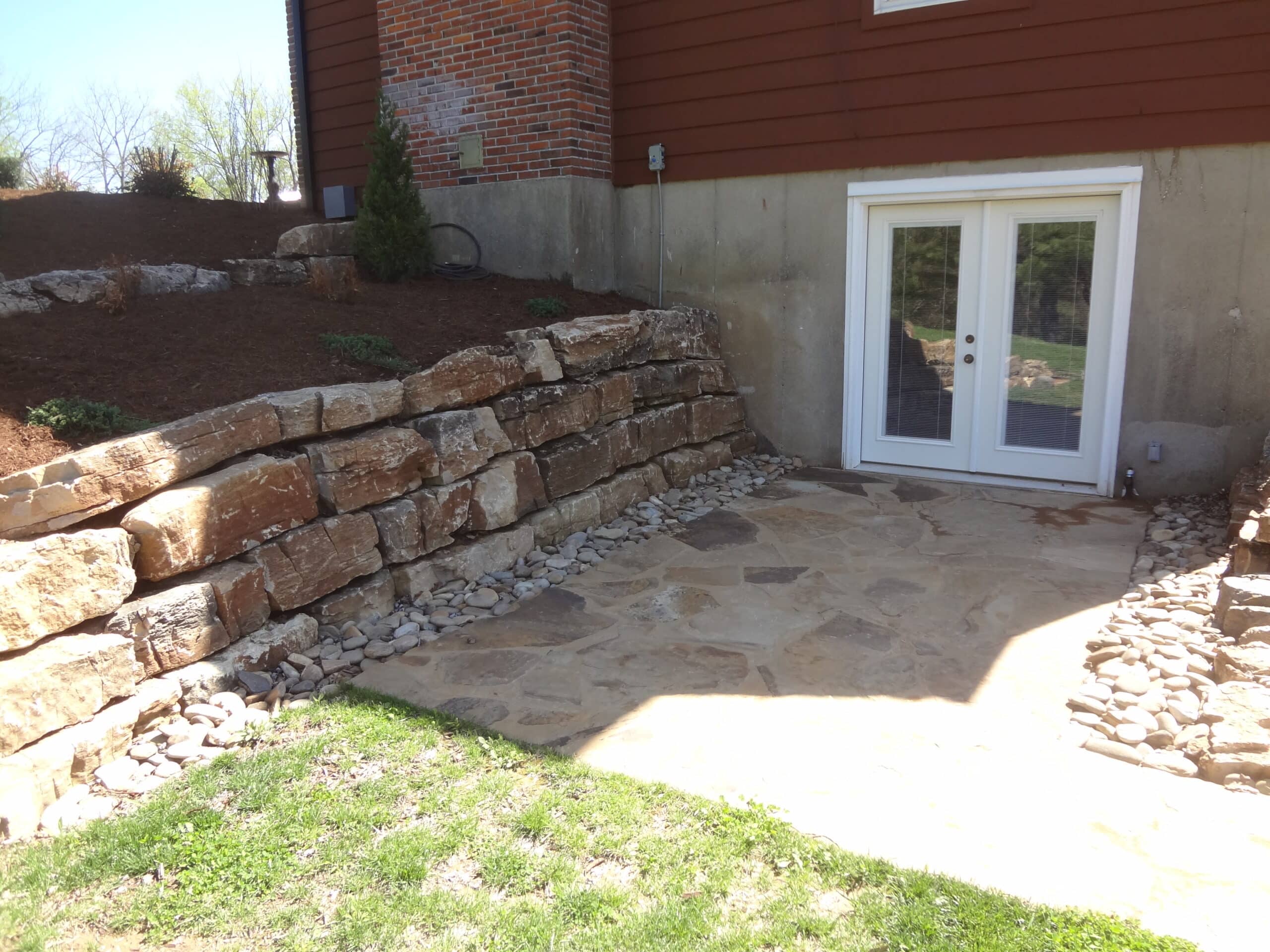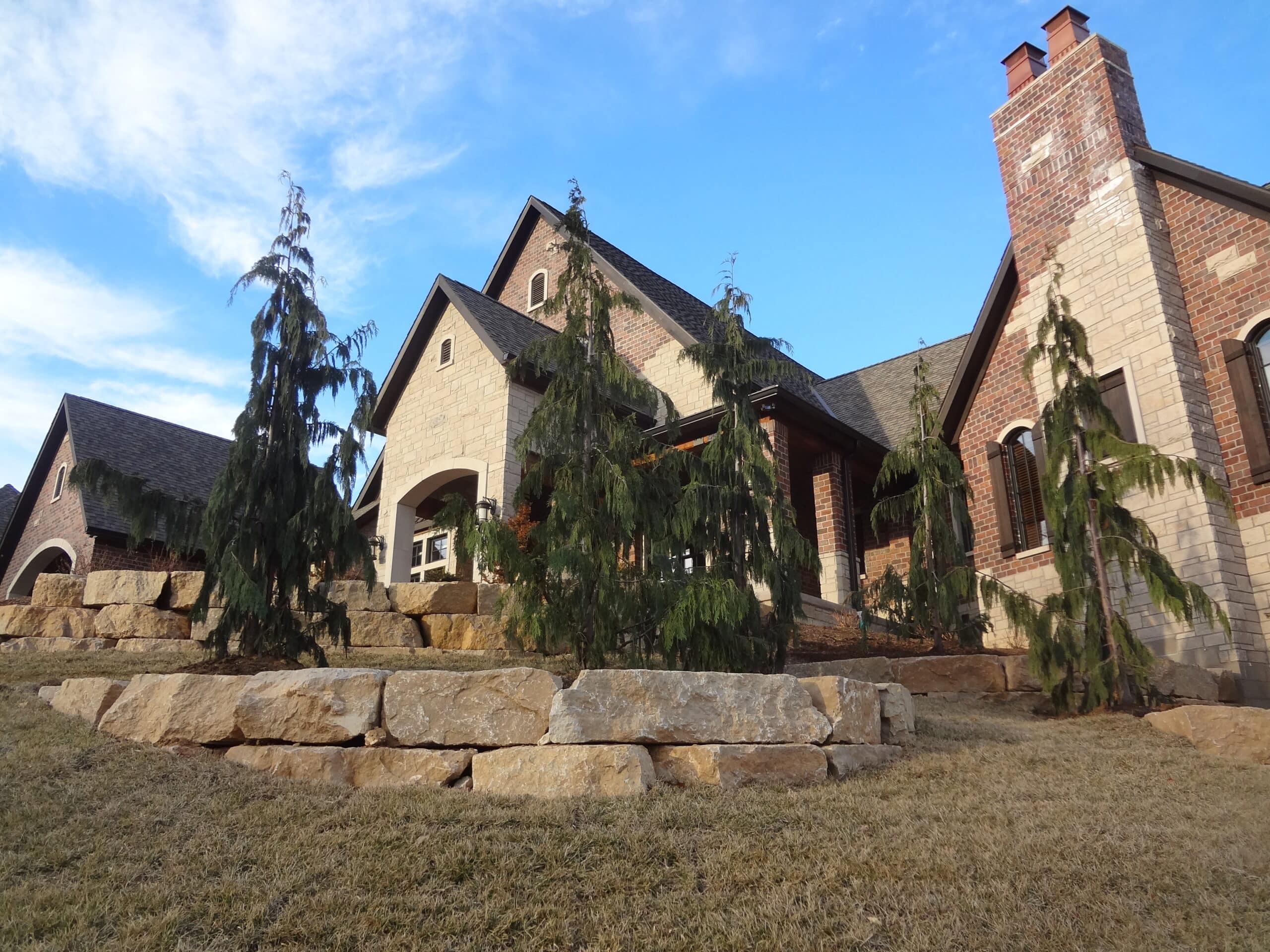 - Decorative Stone wall next to home and trees with landscaping from Lawn Systems, Inc., St. Louis, Missouri