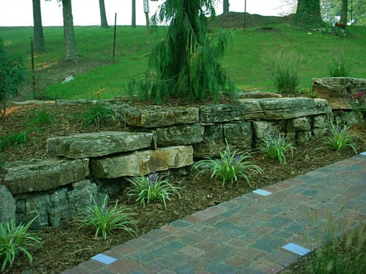- Stone retaining wall and paver walkway leading to trees from Lawn Systems, Inc., St. Louis, Missouri