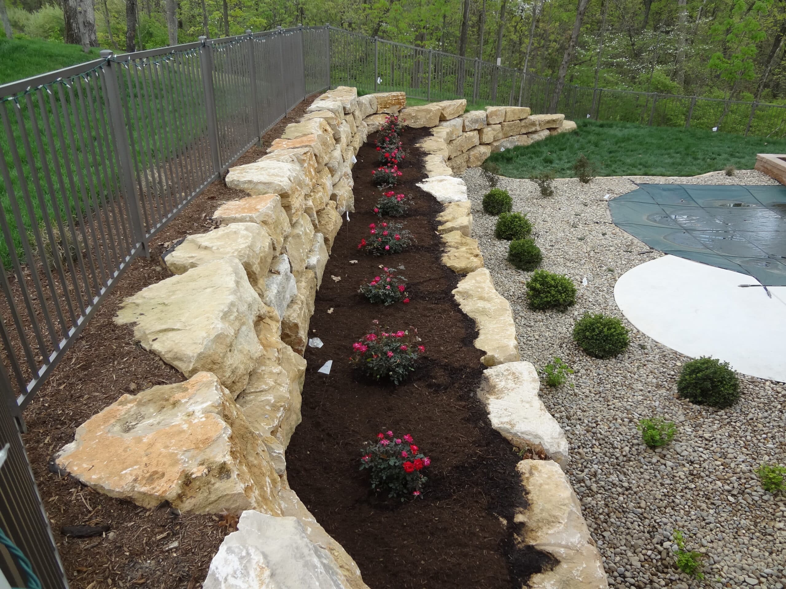 - Garden retaining wall made from stone, leading to pool and patio area from Lawn Systems, Inc., St. Louis, Missouri